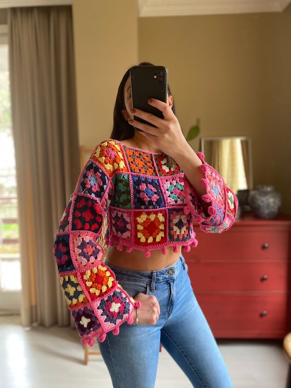 Granny Square Crop Top Long Sleeve Top Crochet Crop Sweater Festival Top Crochet Patchwork Top Etsy Uk